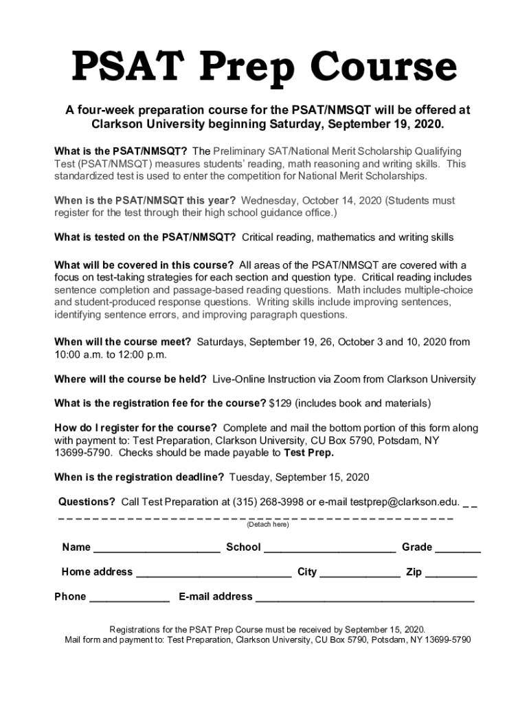 PSAT Prep Course A four-week preparation course for the PSAT/NEST will be offered at Clarkson University beginning Saturday, September 19, 2020. What is the PSAT/NEST? The Preliminary SAT/National