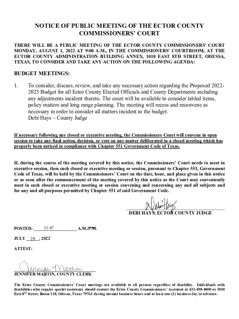 NOTICE OF PUBLIC MEETING OF THE ACTOR COUNTY COMMISSIONERS COURT THERE WILL BE A PUBLIC MEETING OF THE ACTOR COUNTY COMMISSIONERS\' COURT MONDAY, AUGUST 1, 2022, AT 9:00 A.M., IN THE COMMISSIONERS\'