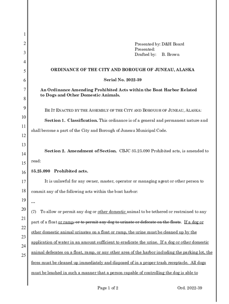 1 2Presented by: D&H Board Presented: Drafted by: B. Brown3 4 5ORDINANCE OF THE CITY AND BOROUGH OF JUNEAU, ALASKA6Serial No. 2022397An Ordinance Amending Prohibited Acts within the Boat Harbor Related