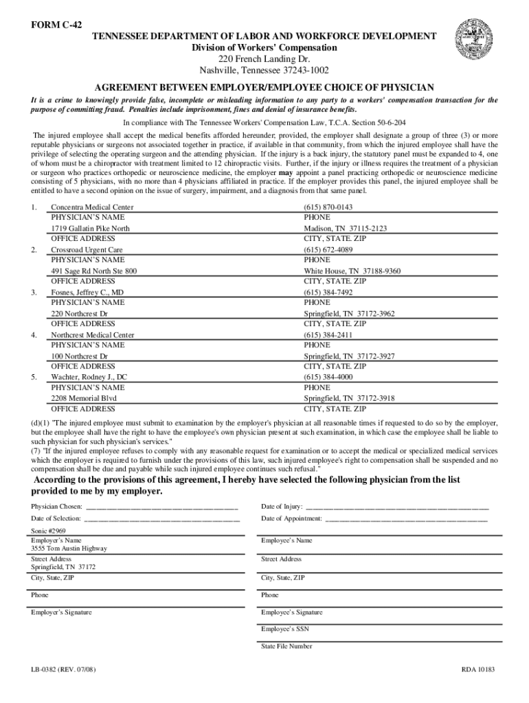 FORM C42 TENNESSEE DEPARTMENT OF LABOR AND WORKFORCE DEVELOPMENT Division of Workers\' Compensation 220 French Landing Dr. Nashville, Tennessee 372431002 AGREEMENT BETWEEN EMPLOYER/EMPLOYEE CHOICE