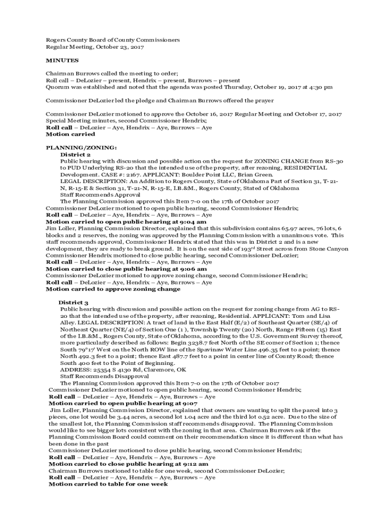 Rogers County Board of County Commissioners Regular Meeting, October 23, 2017, MINUTES Chairman Burrows called the meeting to order; Roll call Dozier present, Hendrix present, Burrows present Quorum