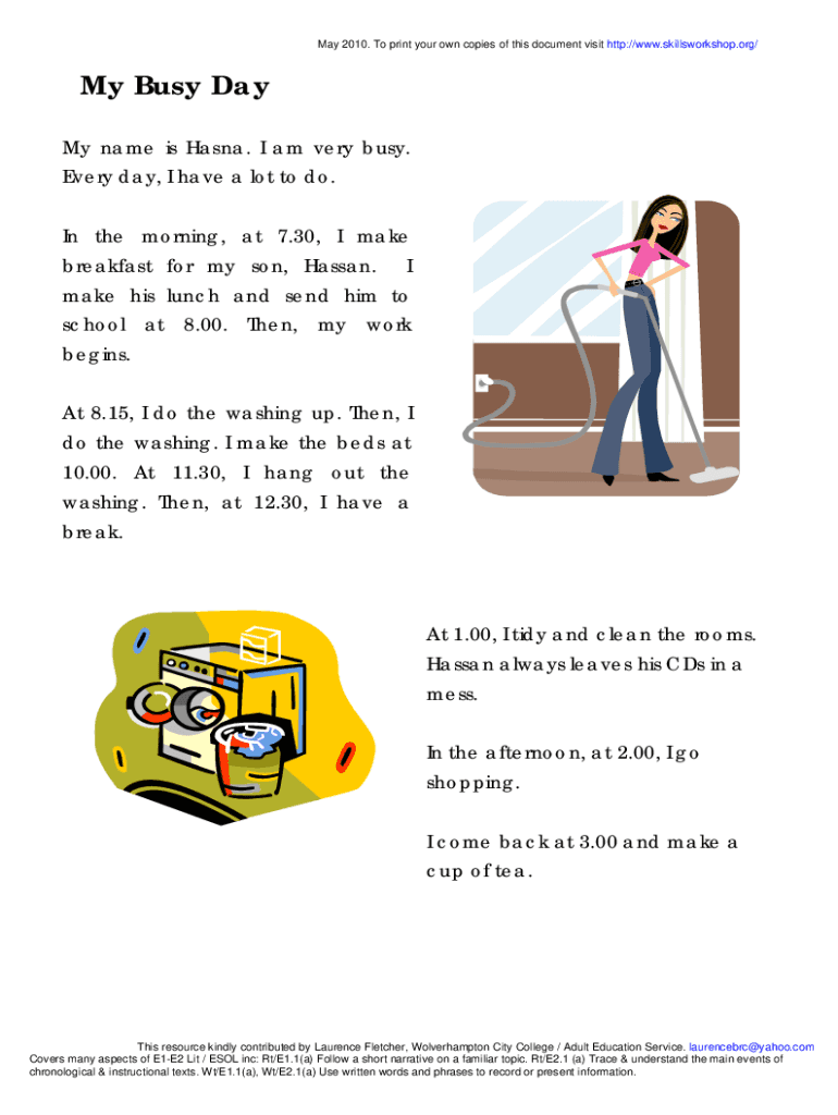 May 2010. To print your own copies of this document visit http://www.skillsworkshop.org/My Busy Day My name is Hanna. I am very busy. Every day, I have a lot to do. In the morning, at 7.30, I make