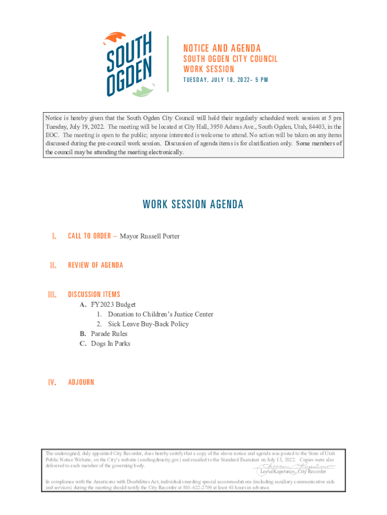 N NOTICE AND AGE SOUTH OGDEN CITY COUNCIL WORK SESSION TUESDAY, JULY 19, 2022 5 Notice is hereby given that the South Ogden City Council will hold their regularly scheduled work session at 5 pm Tuesday,