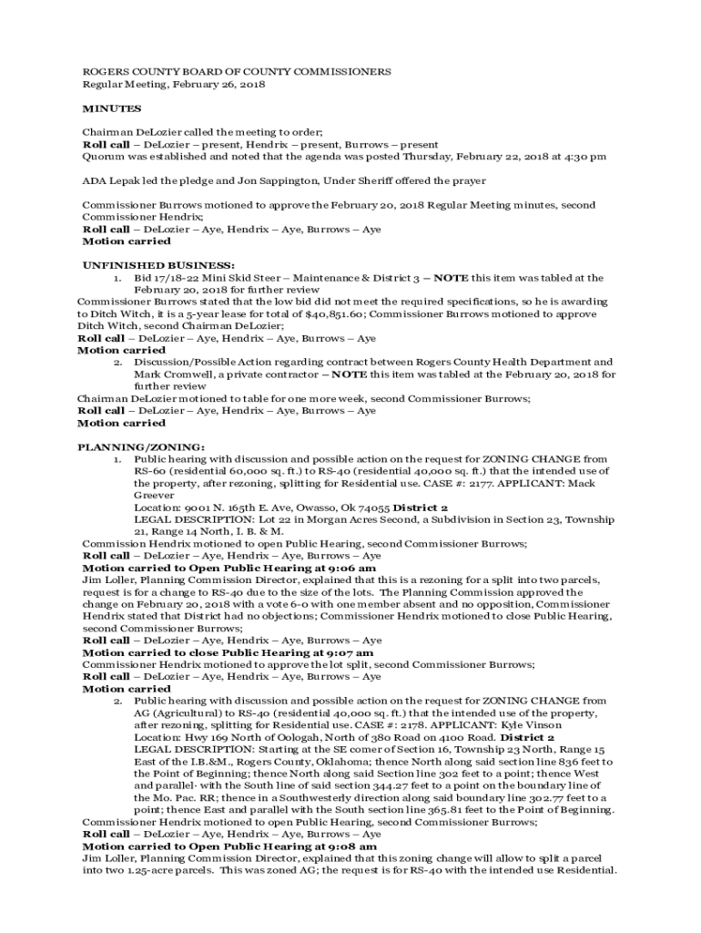 ROGERS COUNTY BOARD OF COUNTY COMMISSIONERS Regular Meeting, February 26, 2018, MINUTES Chairman Dozier called the meeting to order; Roll call Dozier present, Hendrix present, Burrows present Quorum