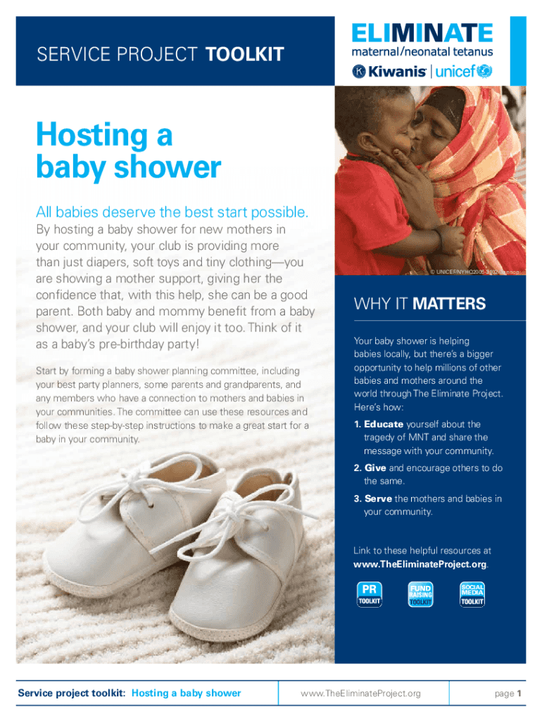 Service project toolkitHosting a baby shower All babies deserve the best start possible. By hosting a baby shower for new mothers in your community, your club is providing more than just diapers,