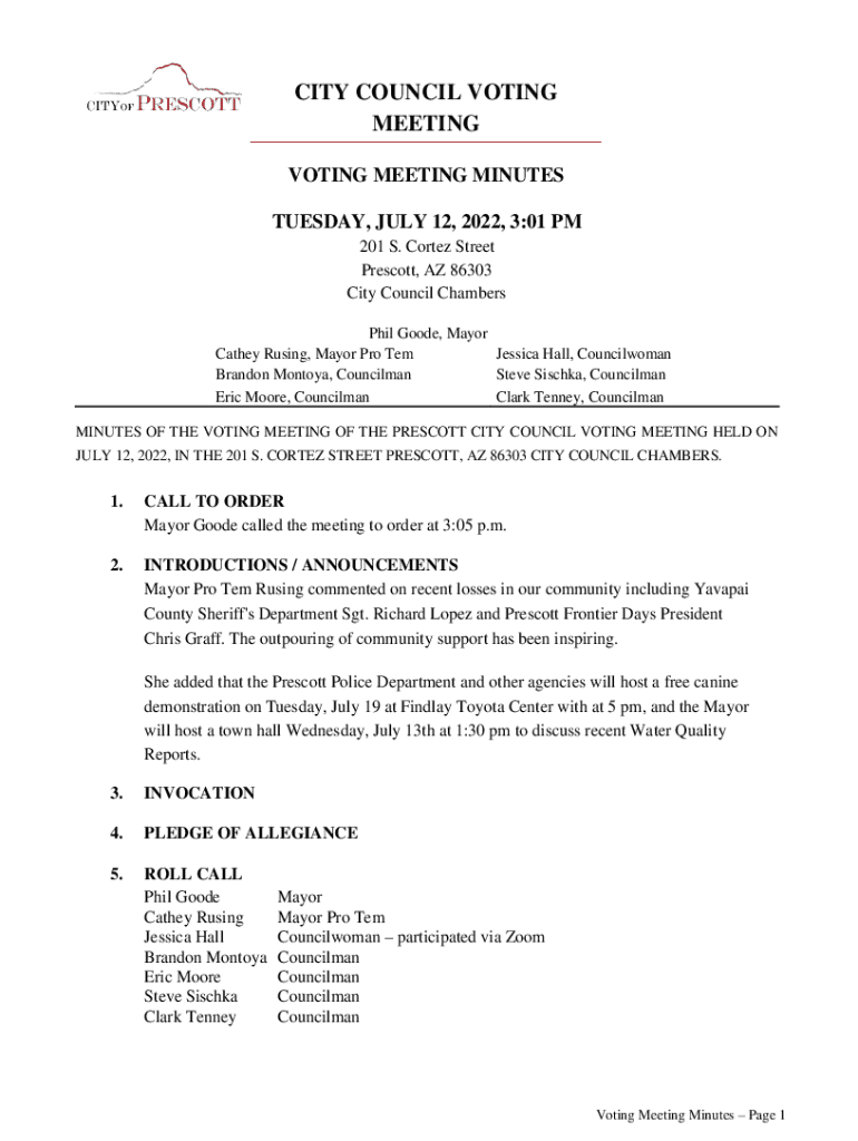CITY COUNCIL VOTING MEETING MINUTES TUESDAY, JULY 12, 2022, 3:01 PM 201 S. Cortez Street Prescott, AZ 86303 City Council Chambers Phil Goode, Mayor Cathy Using, Mayor Pro Tem Jessica Hall, Councilwoman