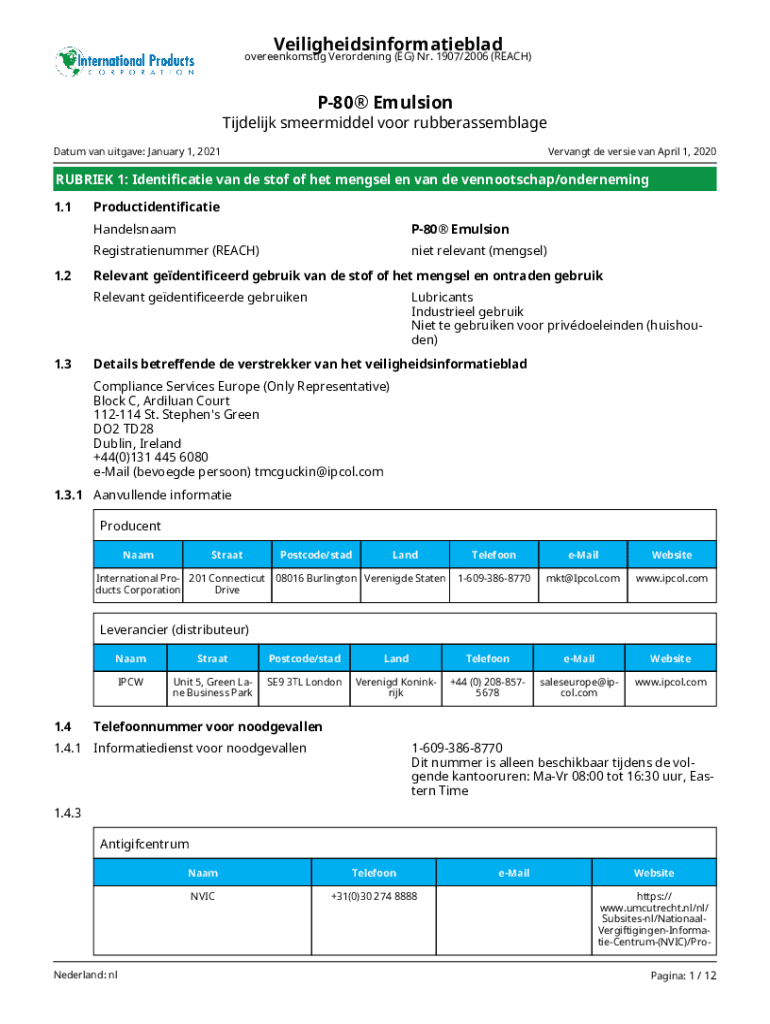 Veiligheidsinformatiebladovereenkomstig Broadening (EG) NR. 1907/2006 (REACH)P80 EmulsionTijdelijk smeermiddel poor rubber assemblage