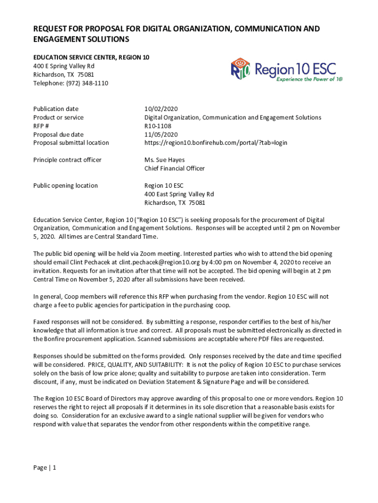 REQUEST FOR PROPOSAL FOR DIGITAL ORGANIZATION, COMMUNICATION AND ENGAGEMENT SOLUTIONS EDUCATION SERVICE CENTER, REGION 10 400 E Spring Valley Rd Richardson, TX 75081 Telephone: (972) 3481110 Publication
