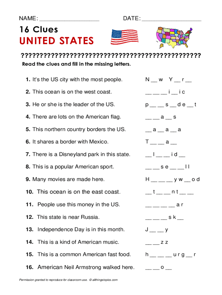 NAME: ___DATE: ___16 CluesUNITED STATES ???????????????????????????????????????????????? Read the clues and fill in the missing letters.1. It's the US city with the most people. N __ w2. This ocean