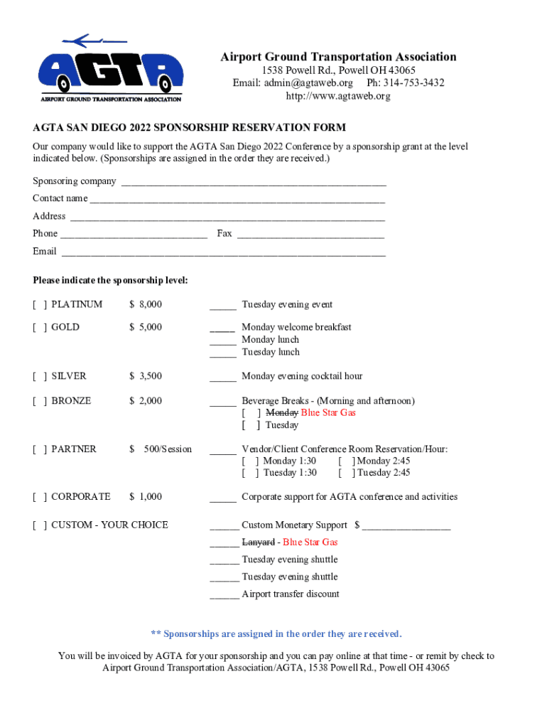 Airport Ground Transportation Association 1538 Powell Rd., Powell OH 43065 Email: admin@agtaweb.org pH: 3147533432 http://www.agtaweb.org AGRA SAN DIEGO 2022 SPONSORSHIP RESERVATION From Our company