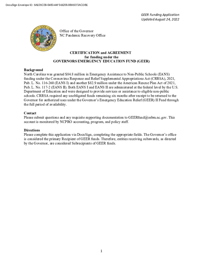 BEER Funding Application Updated August 24, 2022, Office of the Governor NC Pandemic Recovery OfficeCERTIFICATION and AGREEMENT for funding under the GOVERNORS EMERGENCY EDUCATION FUND (BEER) Background