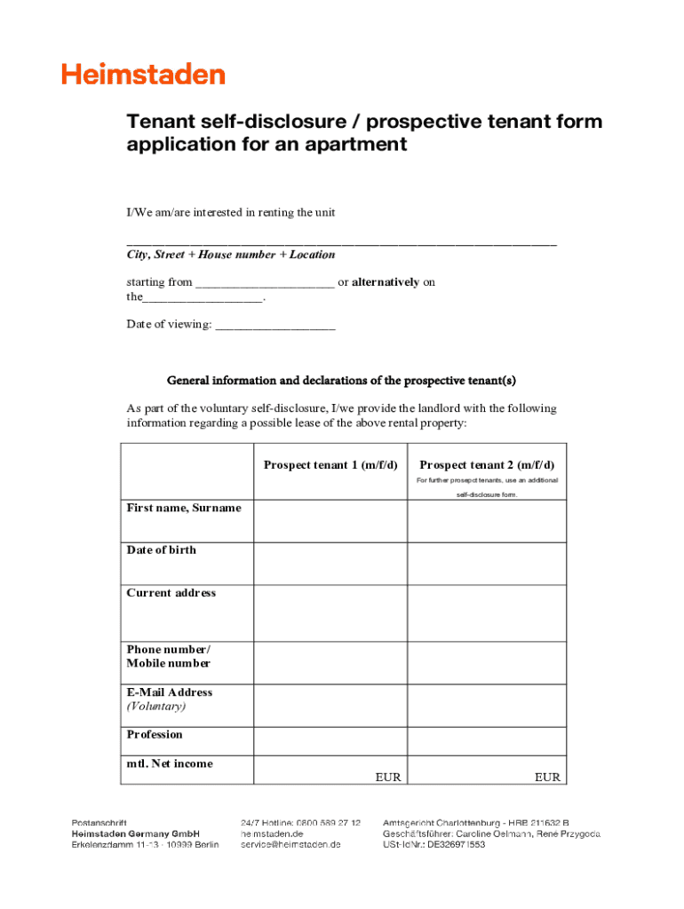 Tenant self disclosure / prospective tenant form application for an apartment/We are/are interested in renting the unit ___ City, Street + House number + Location starting from ___ or alternatively