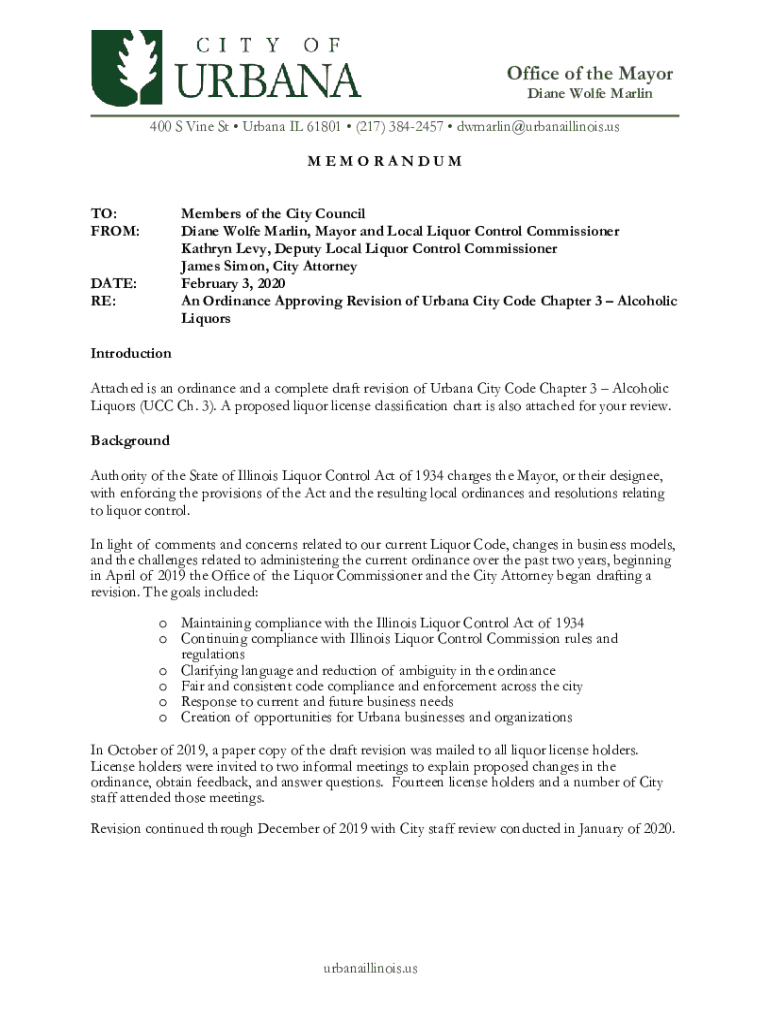 Office of the Mayor Diane Wolfe Marlin400 S Vine St Urbana IL 61801 (217) 3842457 dwmarlin@urbanaillinois.us MEMORANDUM TO: FROM:Members of the City Council Diane Wolfe Marlin, Mayor and Local Liquor