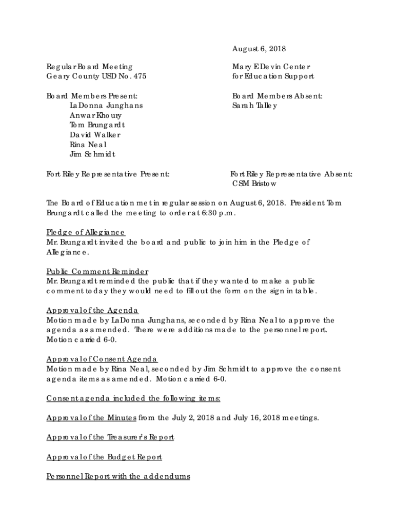 August 6, 2018, Regular Board Meeting Geary County USD No. 475Mary E Devin Center for Education SupportBoard Members Present: Ladonna Jungian Anwar Hours Tom Drunkard David Walker Ring Neal Jim SchmidtBoard