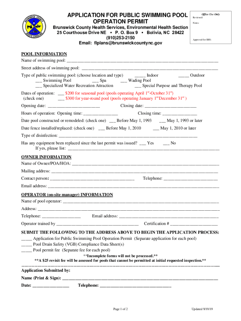APPLICATION FOR PUBLIC SWIMMING POOL OPERATION PERMIT Brunswick County Health Services, Environmental Health Section 25 Courthouse Drive NE P. O. Box 9 Bolivia, NC 28422 (910)2532150 Email: flplans@brunswickcountync.govOffice