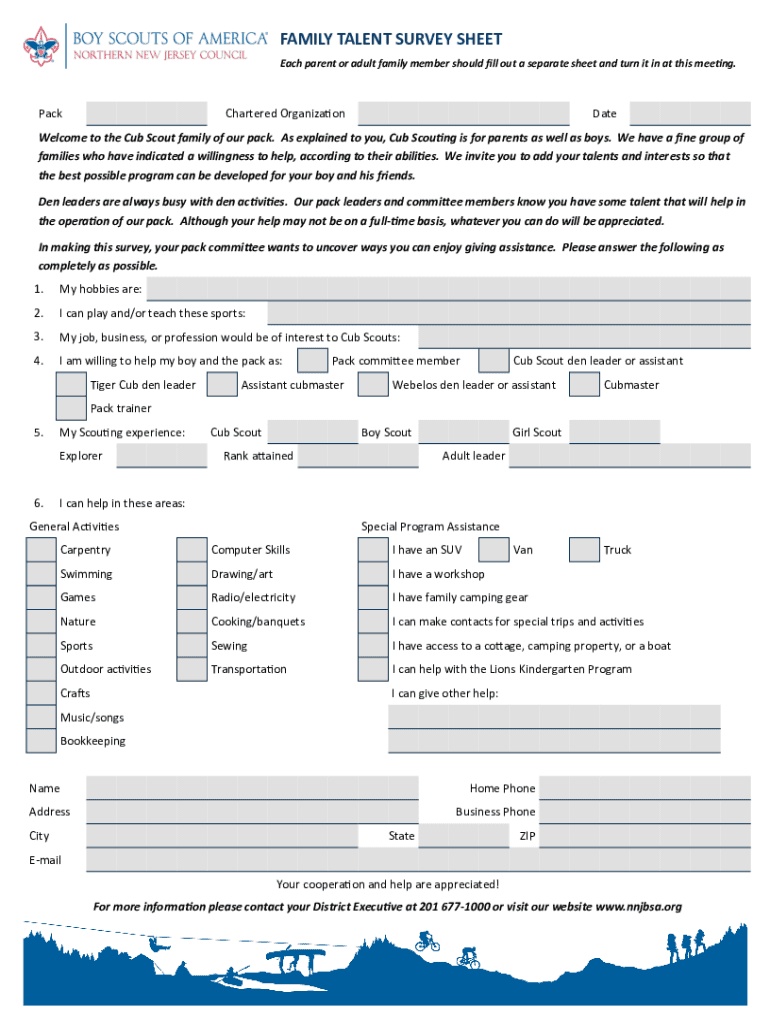 Get the free FAMILY TALENT SURVEY SHEET - Pack 168