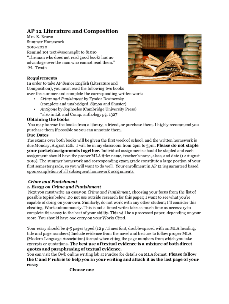 AP 12 Literature and Composition Mrs. K. Brown Summer Homework 20192020 Remind 101 text @soonsaplit to 81010 The man who does not read good books has no advantage over the man who cannot read them.