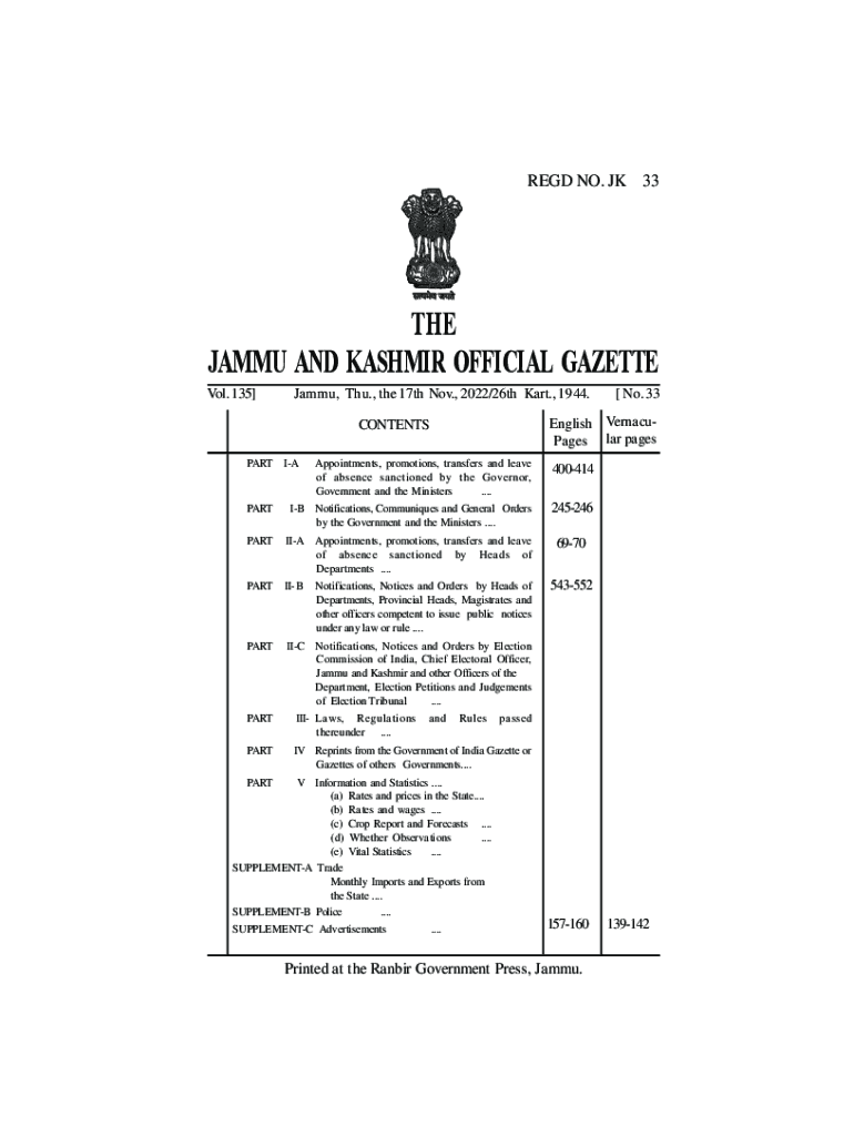 RED NO. JK33THE JAMMY AND KASHMIR OFFICIAL GAZETTE Vol. 135]Jammy, Thu., the 17th Nov., 2022/26th Kart., 1944.[No. 33Pageslar pages. English VernacuCONTENTS PART IA Appointments, promotions, transfers