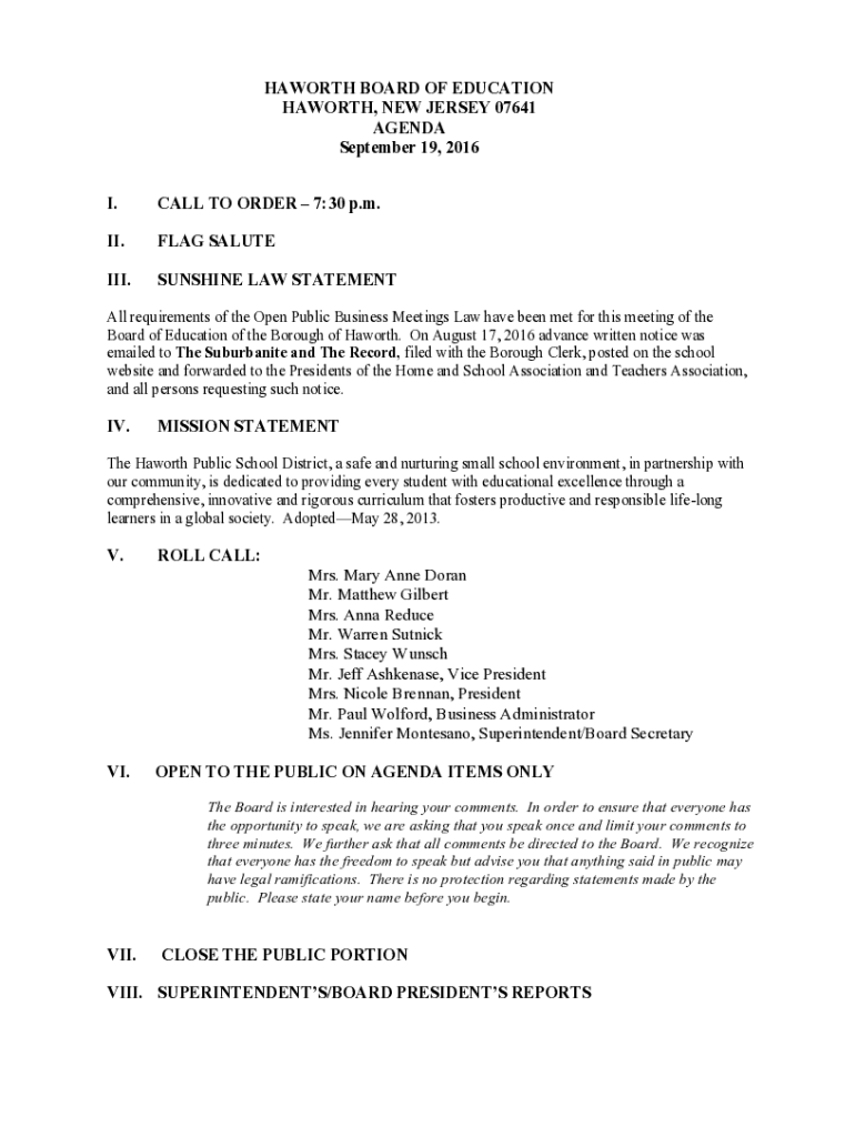 HAYWORTH BOARD OF EDUCATION HAYWORTH, NEW JERSEY 07641 AGENDA September 19, 2016, I.CALL TO ORDER 7:30 p.m.II.FLAG SALUTE.SUNSHINE LAW Statement requirements of the Open Public Business Meetings Law