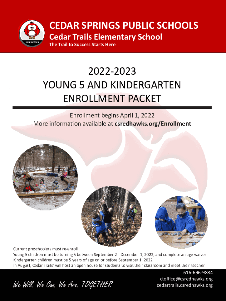 CEDAR SPRINGS PUBLIC SCHOOLS Cedar Trails Elementary School The Trail to Success Starts Here20222023 YOUNG 5 AND KINDERGARTEN ENROLLMENT PACKET Enrollment begins April 1, 2022, More information available