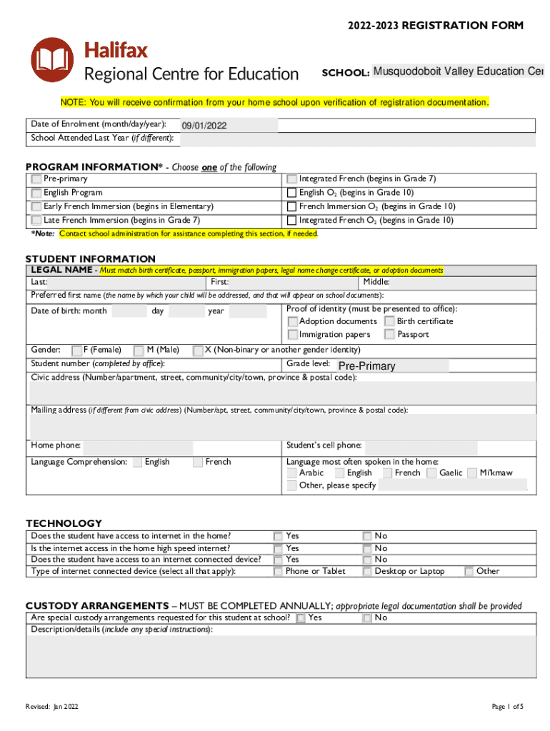 20222023 REGISTRATION PRESCHOOL: Musquodoboit Valley Education Cent NOTE: You will receive confirmation from your home school upon verification of registration documentation. Date of Enrollment (month/day/year):