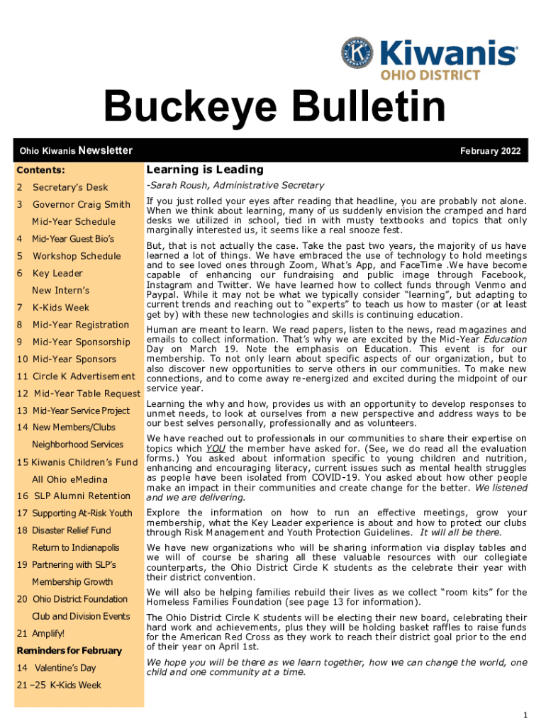 Buckeye Bulletin Ohio Kiwanis Newsletter January 2February 2022Contents:Learning is Leading2Secretarys Desk Sarah Rough, Administrative Secretary3Governor Craig Smith you just rolled your eyes after