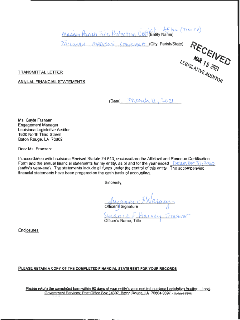 /A L.LU. L/9 That)t5 v TRANSMITTAL LETTER ANNUAL FINANCIAL STATEMENTS Ms. Gayle Fran sen Engagement Manager Louisiana Legislative Auditor 1600 North Third Street Baton Rouge, LA 70802 Dear Ms. Fran