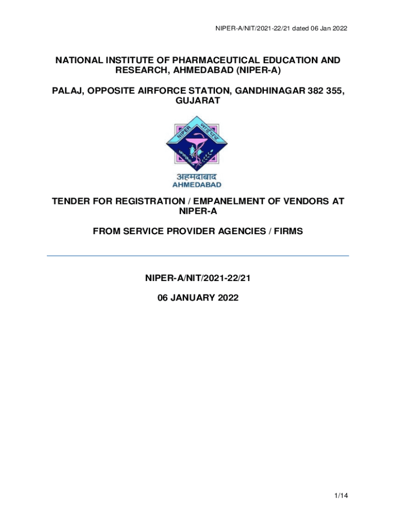 NIP ERA/NIT/202122/21 dated 06 Jan 2022NATIONAL INSTITUTE OF PHARMACEUTICAL EDUCATION AND RESEARCH, AHMEDABAD (NIP ERA) PAL AJ, OPPOSITE AIRBORNE STATION, GANDHINAGAR 382 355, GUJARATTENDER FOR REGISTRATION