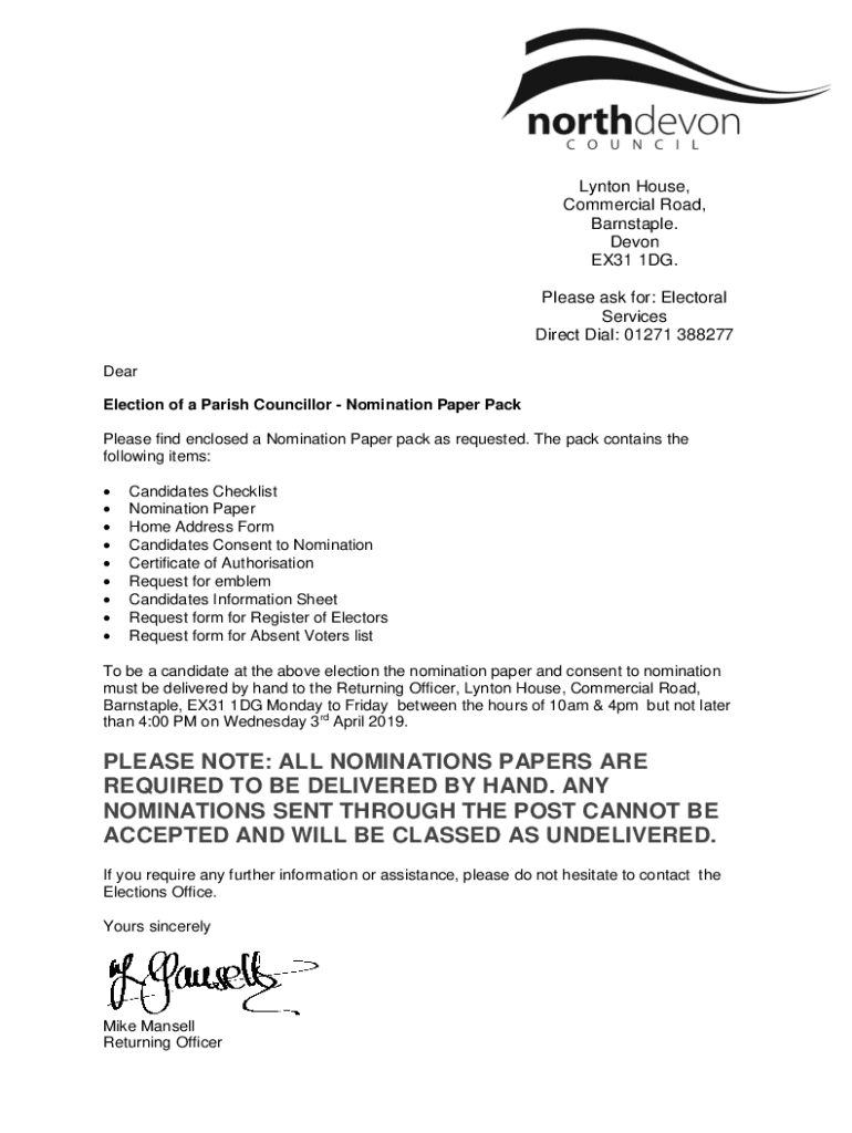 Lyndon House, Commercial Road, Barn staple. Devon EX31 1DG. Please ask for: Electoral Services Direct Dial: 01271 388277 Delegates: 18th March 2019Election of a Parish Councillor Nomination Paper