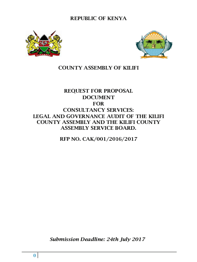 REPUBLIC OF KENYACOUNTY ASSEMBLY OF KILIFIREQUEST FOR PROPOSAL DOCUMENT FOR CONSULTANCY SERVICES: LEGAL AND GOVERNANCE AUDIT OF THE VILIFY COUNTY ASSEMBLY AND THE VILIFY COUNTY ASSEMBLY SERVICE BOARD.