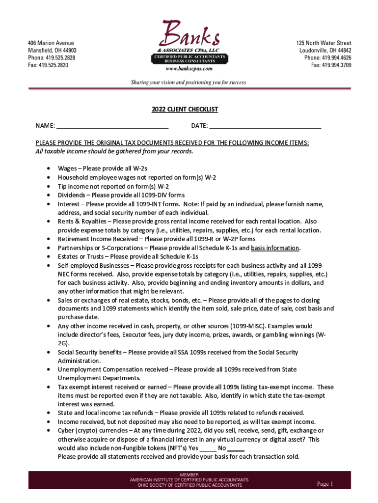 2022 CLIENT CHECKLIST NAME: ___DATE: ___PLEASE PROVIDE THE ORIGINAL TAX DOCUMENTS RECEIVED FOR THE FOLLOWING INCOME ITEMS: All taxable income should be gathered from your records. Wages Please provide