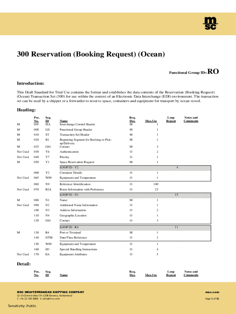 300 Reservation (Booking Request) (Ocean) Functional Group Introduction: This Draft Standard for Trial Use contains the format and establishes the data contents of the Reservation (Booking Request)