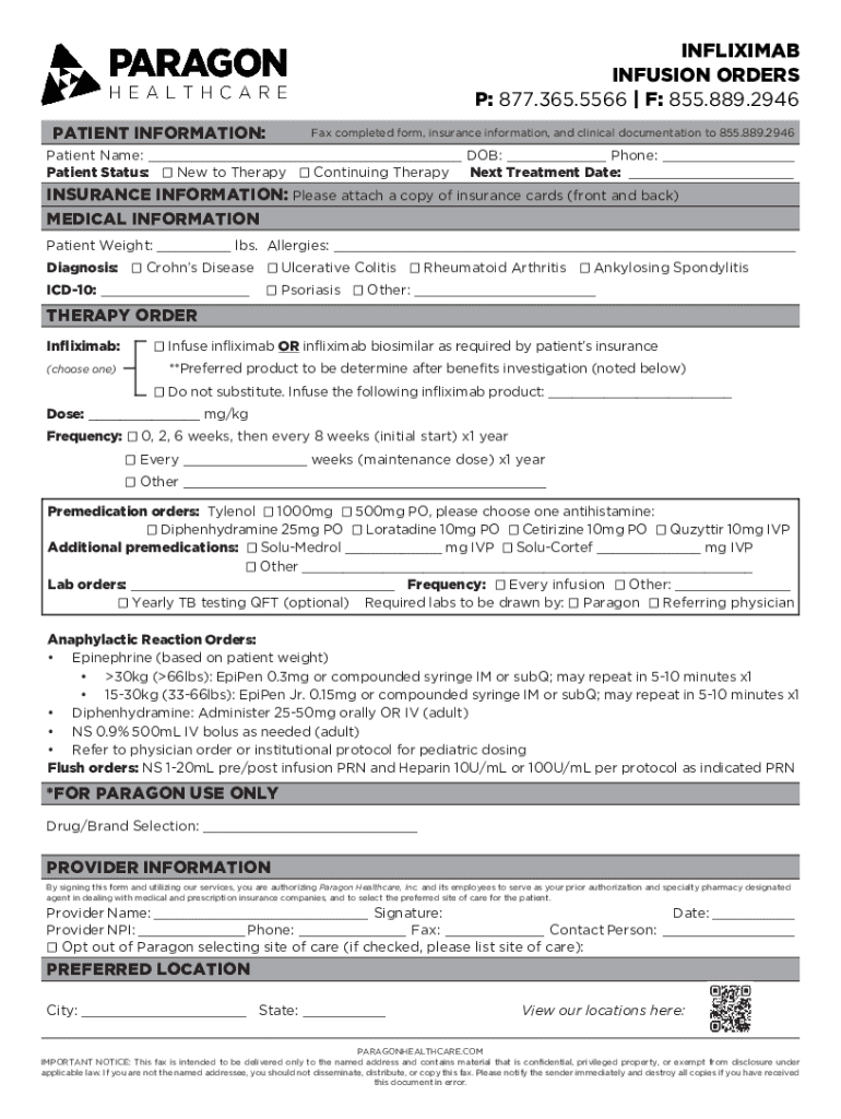 INFUSION ORDERS P: 877.365.5566 | F: 855.889.2946 PATIENT INFORMATION:Fax completed form, insurance information, and clinical documentation to 855.889.2946Patient Name: ___ DOB: ___ Phone: ___ Patient