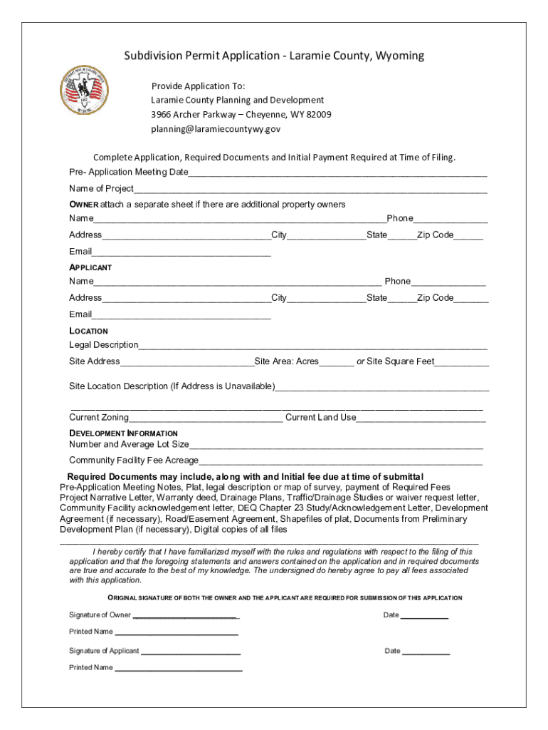 Subdivision Permit Process and Application Laramie County Planning and Development 3966 Archer Parkway Cheyenne, WY 82009 3076334303 planning@laramiecountywy.govAll applicants shall first meet with