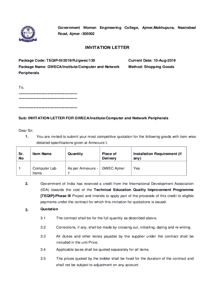 Government Women Engineering College, Ajmer, Makhupura, Faridabad Road, Ajmer 305002INVITATION LETTER Package Code: TEQIPIII/2019/RJ/Gwen/130Current Date: 10Aug2019Package Name: WECA/Institute/Computer