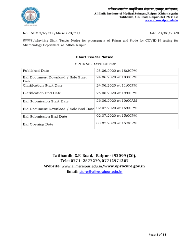 , () All India Institute of Medical Sciences, Raipur (Chhattisgarh) Taliban, GE Road, Raipur492 099 (CG) www.aiimsraipur.edu.inNo.: AIMS/R/CS /Micro/20/71/Date:23/06/2020./Sub:Inviting Short Tender
