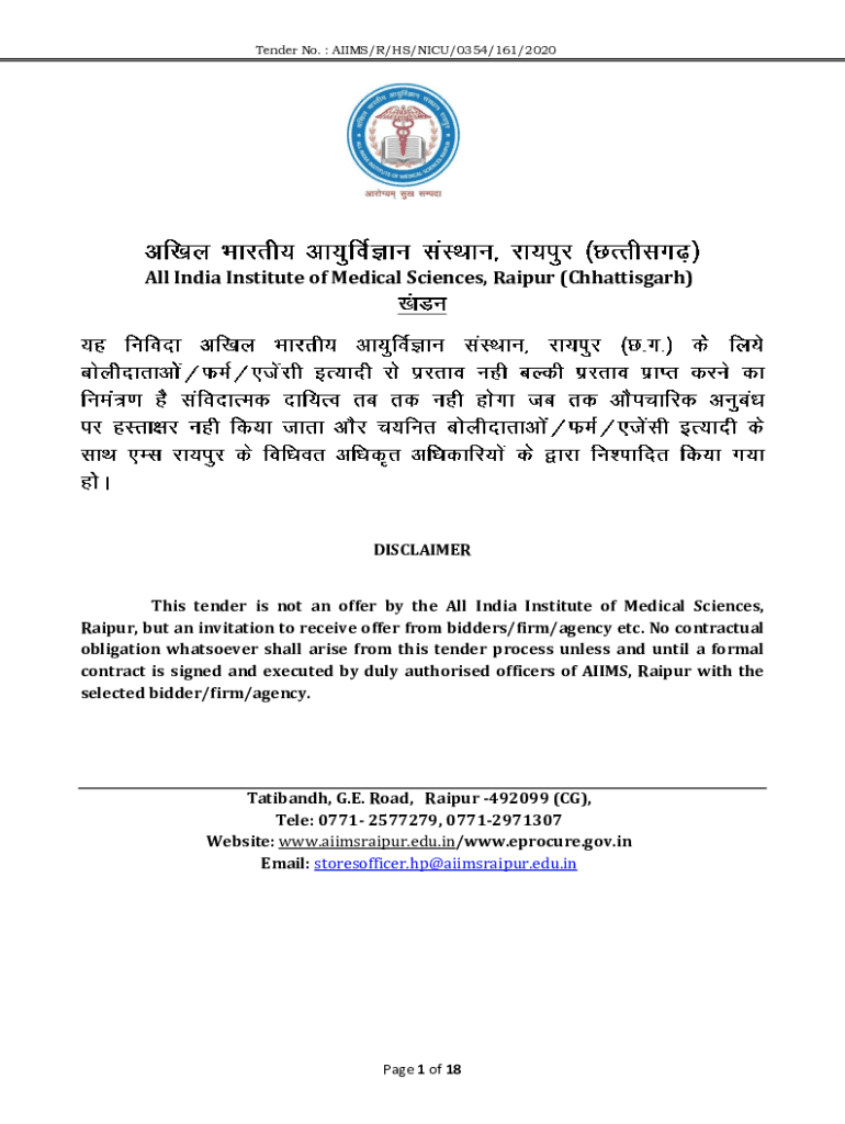 Tender No. AIMS/R/HS/NICU/0354/161/2020All India Institute of Medical Sciences, Raipur (Chhattisgarh)DISCLAIMER This tender is not an offer by the India Institute of Medical Sciences, Raipur, but
