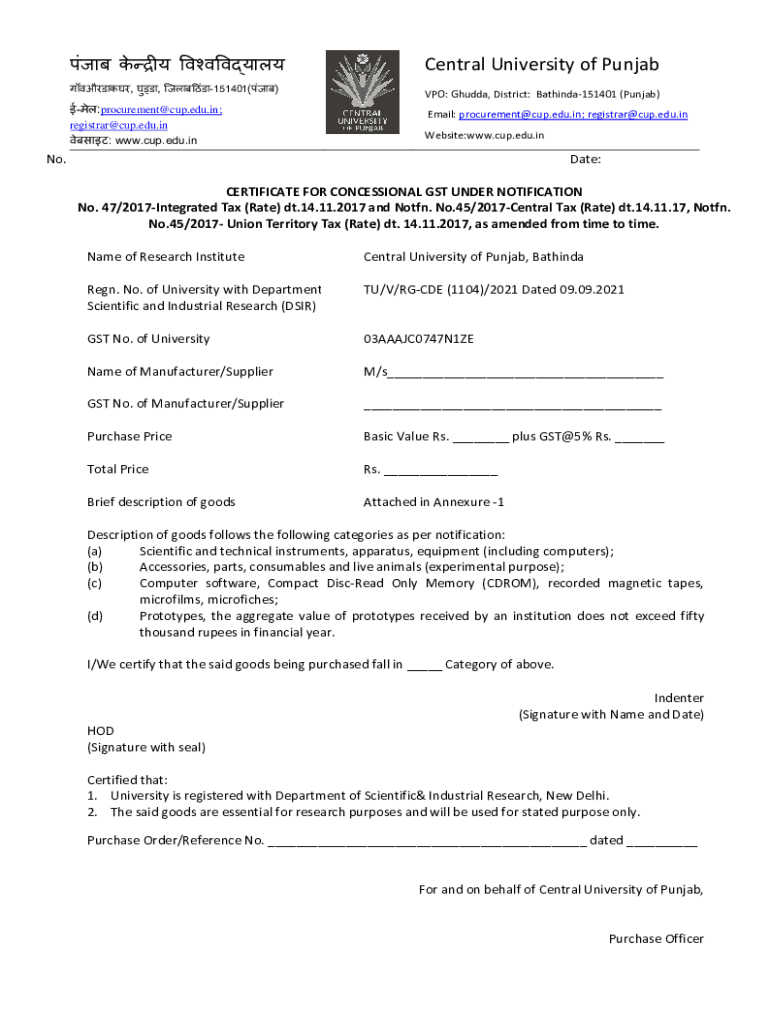 Central University of Punjab, 151401()IPO: Gouda, District: Bathinda151401 (Punjab):procurement@cup.edu.in; registrar@cup.edu.in : www.cup.edu.inEmail: procurement@cup.edu.in; registrar@cup.edu.in