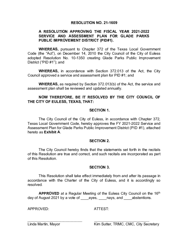 RESOLUTION NO. 211609 A RESOLUTION APPROVING THE FISCAL YEAR 20212022 SERVICE AND ASSESSMENT PLAN FOR GLADE PARKS PUBLIC IMPROVEMENT DISTRICT (PID#1). WHEREAS, pursuant to Chapter 372 of the Texas