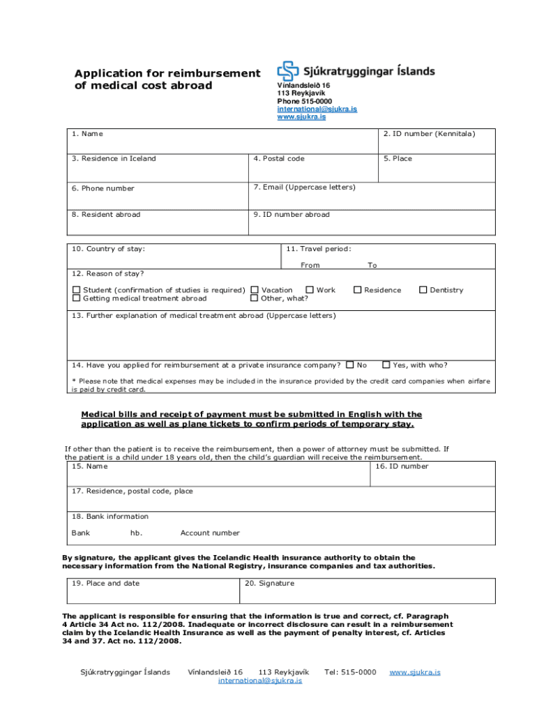 Application for reimbursement of medical cost abroadVnlandslei 16 113 Reykjavík Phone 5150000 international@sjukra.is www.sjukra.is1. Name2. ID number (Kennith)3. Residence in Iceland4. Postal code6.