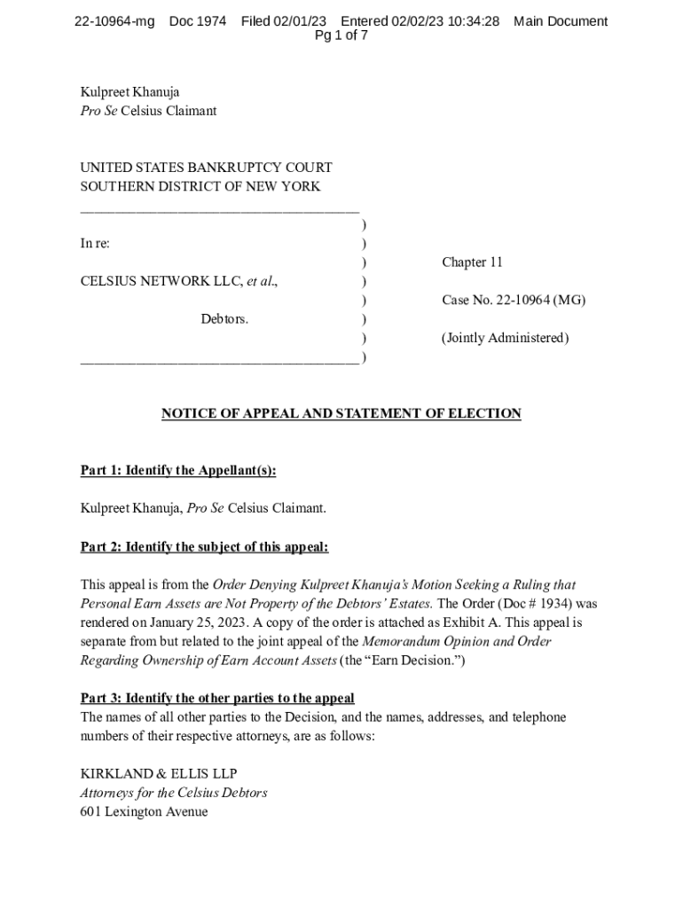2210964mgDoc 1974Filed 02/01/23 Entered 02/02/23 10:34:28 Pg 1 of 7Main DocumentKulpreet Hanuka Pro Se Celsius ClaimantUNITED STATES BANKRUPTCY COURT SOUTHERN DISTRICT OF NEW YORK ___) In re:)) CELSIUS