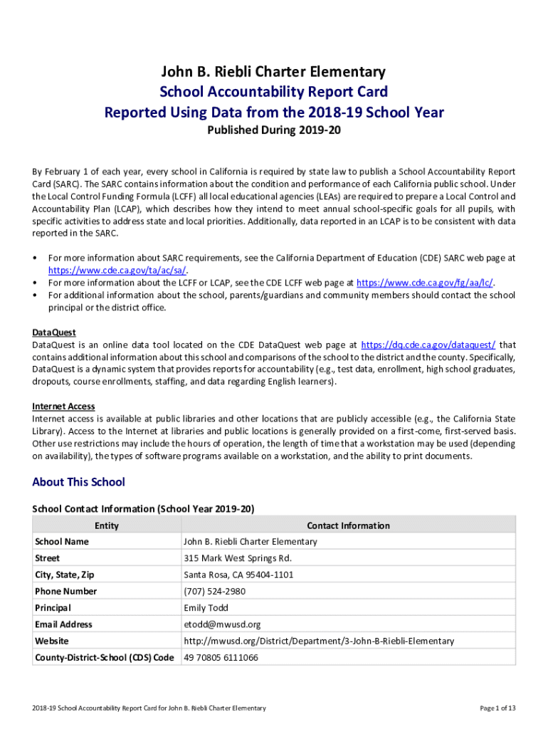 John B. Riel Charter Elementary School Accountability Report Card Reported Using Data from the 201819 School Year Published During 201920 By February 1 of each year, every school in California is