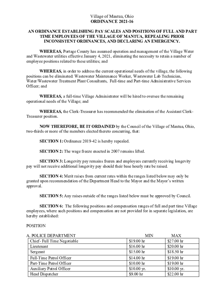 Village of Mantra, Ohio ORDINANCE 202116 AN ORDINANCE ESTABLISHING PAY SCALES AND POSITIONS OF FULL AND PART TIME EMPLOYEES OF THE VILLAGE OF MANTRA, REPEALING PRIOR INCONSISTENT ORDINANCES, AND DECLARING