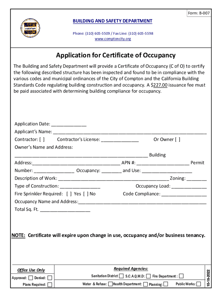 Form: B007BUILDING AND SAFETY DEPARTMENT Phone: (310) 6055509 / Fax Line: (310) 6055598 www.comptoncity.orgApplication for Certificate of Occupancy The Building and Safety Department will provide