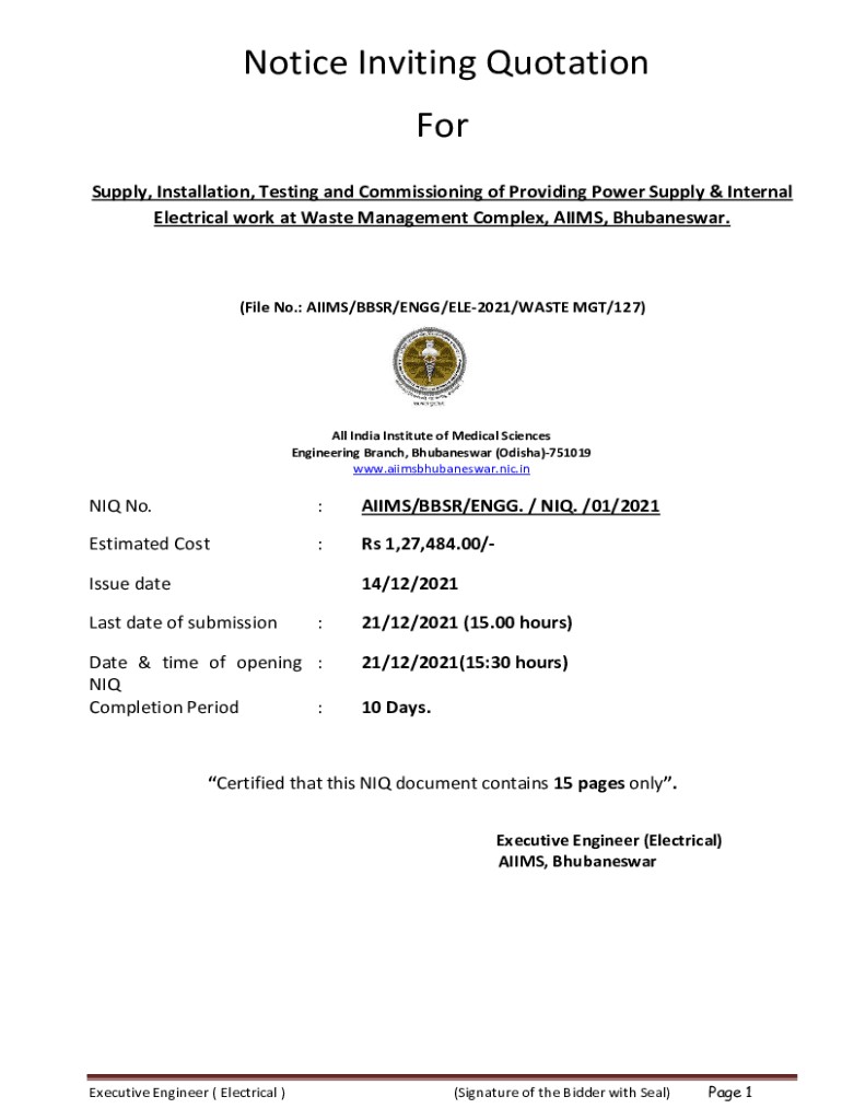 Notice Inviting Quotation For Supply, Installation, Testing and Commissioning of Providing Power Supply & Internal Electrical work at Waste Management Complex, AIMS, Bhubaneswar.(File No.: AIMS/BBS/EGG/ELE2021/WASTE