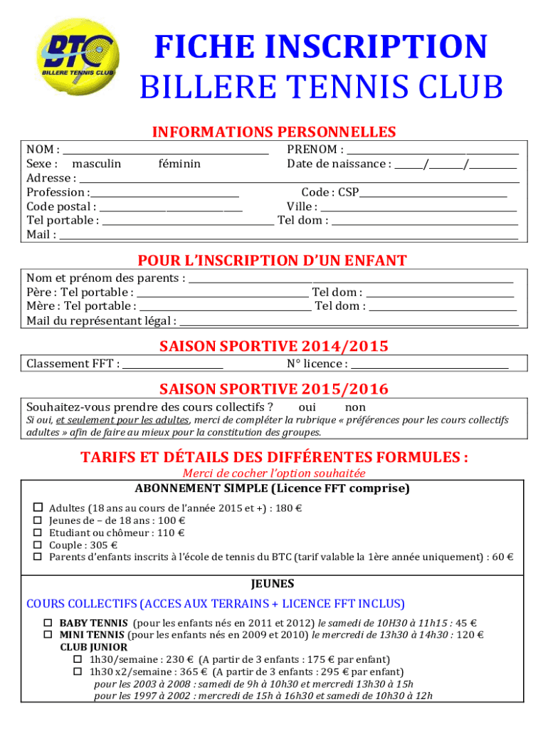 Fiche inscription billere tennis is a registration form used for enrolling players in tennis tournaments and events.