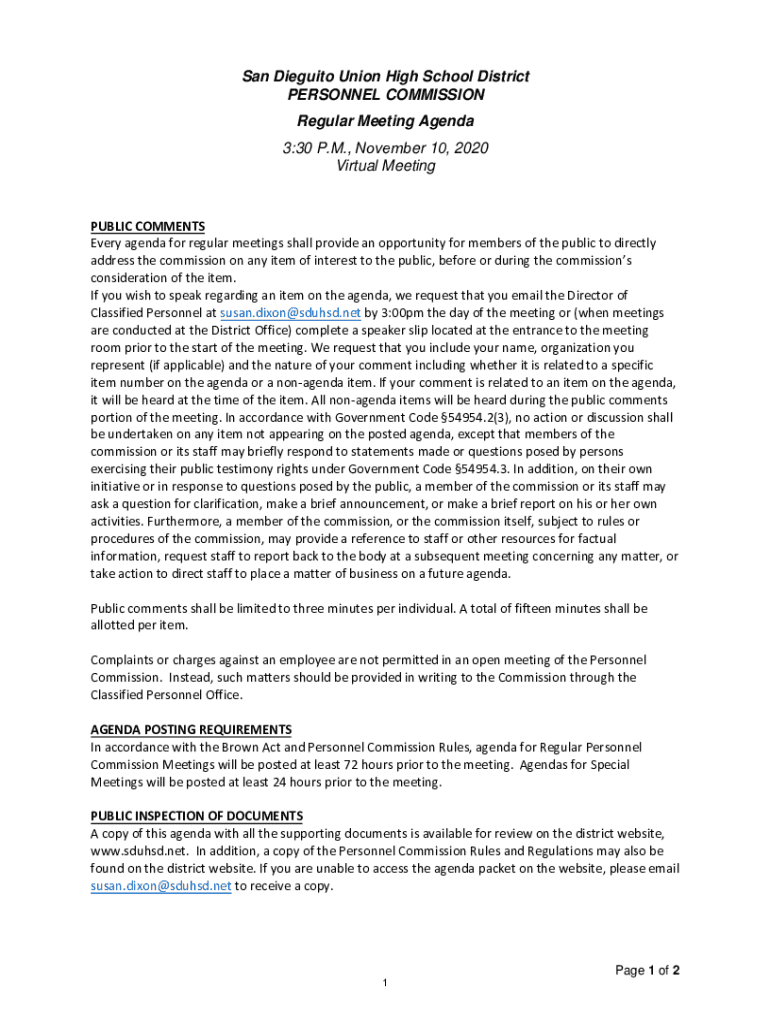 San Diegueño Union High School District PERSONNEL COMMISSION Regular Meeting Agenda 3:30 P.M., November 10, 2020, Virtual MeetingPUBLIC COMMENTS Every agenda for regular meetings shall provide an
