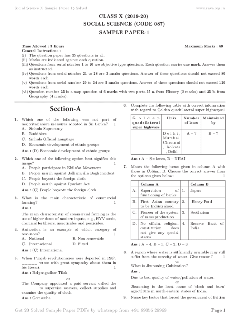 Social Science X Sample Paper 15 Solved.lava.org.class X (201920) SOCIAL SCIENCE (CODE 087) SAMPLE PAPER1 Time Allowed : 3 Hours Maximum Marks : 80 General Instructions : (i) The question paper has
