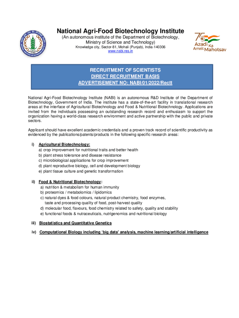 National Agri-food Biotechnology Institute (An autonomous institute of the Department of Biotechnology, Ministry of Science and Technology) Knowledge city, Sector81, Moral (Punjab), India140306 www.nabi.res.inRECRUITMENT