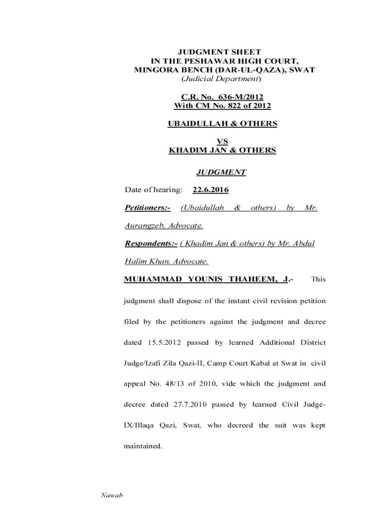 JUDGMENT SHEET IN THE PESHAWAR HIGH COURT, MINGORA BENCH (DARULQAZA), SWAT (Judicial Department) C.R. No. 636M/2012 With CM No. 822 of 2012 ABDULLAH & OTHERS VS KHALID JAN & OTHERS `JUDGMENT Date
